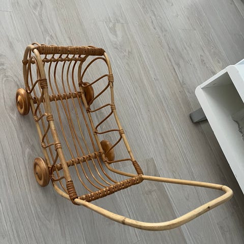 Myydään 40vuotta vanha rottinkinen nukenvaunu uuteen kotiin.