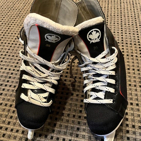 Lasten luistimet koko 35, väriltään musta ja sininen. Luistimissa on nyöritys ja ne sopivat luisteluun / jääkiekon harrastamiseen. Vähällä käytöllä olleet.