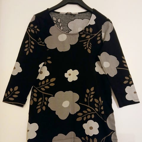 Marimekon musta/valkoinen pikku suomu tunika. Erittäin hyväkuntoinen. Valkoinen edelleen pysynyt valkoisena. Vähän käytetty. Materiaali ryhdikästä trikoota. Kai-kai 50cm, o-h 81cm. Sivuilla taskut (kuva)