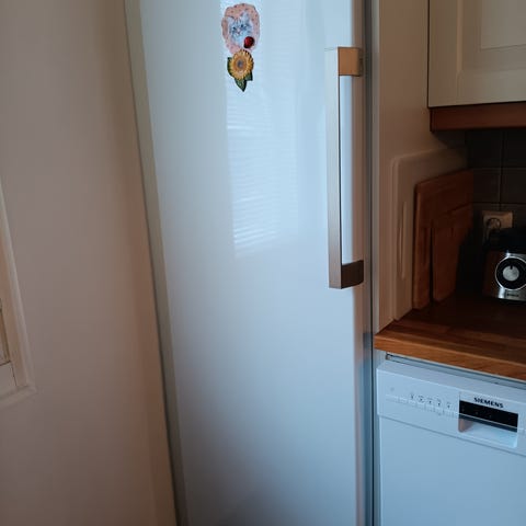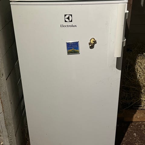 Toimiva jääkaappi, pari lommoa ovessa. Takaseinässä halkeama, näkyy kuvissa
