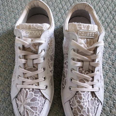 Valkoiset Mary Jane kengät pitsisomisteilla ja ruseteilla.