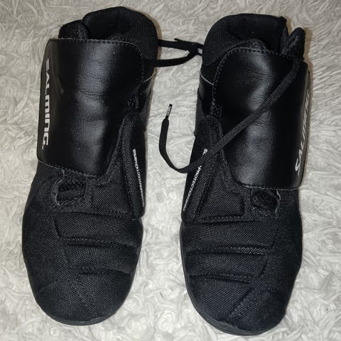 Aloittelevalle maalivahdille vielä ihan soivat pelit käyttöön. Pohjat ommeltu suutarilla uudelleen, joten eivät irtoa. Reunan liimaus irvistää molempien kenkien sisäsyrjästä ja oikea kantapää vähän enemmän. En ole liimauttanut uudelleen. Aika kapoinen versio, oma jalka sen verran kasvanut ettei enää tunnu hyvältä, joten menee myyntiin.