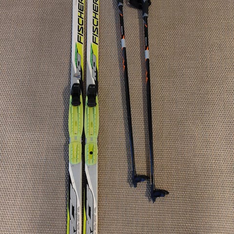 Myydään ehjät, mutta useamman lapsen hiihtämät sukset ja sauvat.