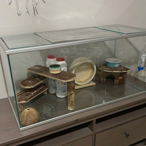 Terraarion mukana tulevat kaikki sisävarusteet: juoksupyörät, puuosat ja muut tarvikkeet.
