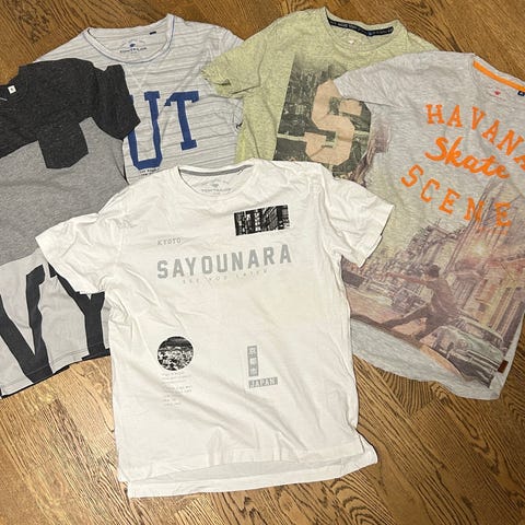 Yhdellä lapsella olleita t-paitoja. 2 paidoista on käyttämättömiä. Samaan aikaan olleet käytössä, koot noin 150-160cm.