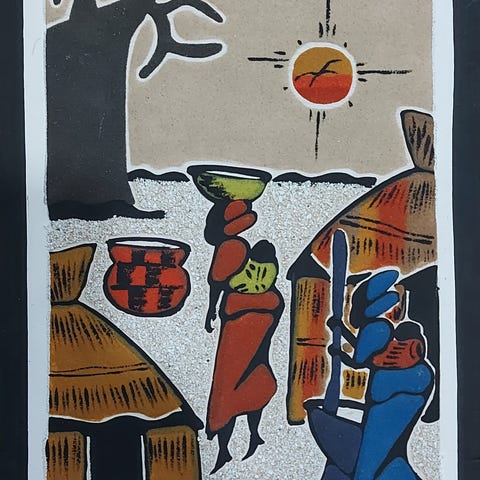 Vanerilevylle tehty afrikkalainen taulu, koko n. 34 x 14 cm. Lähetyskulut ostajalle.