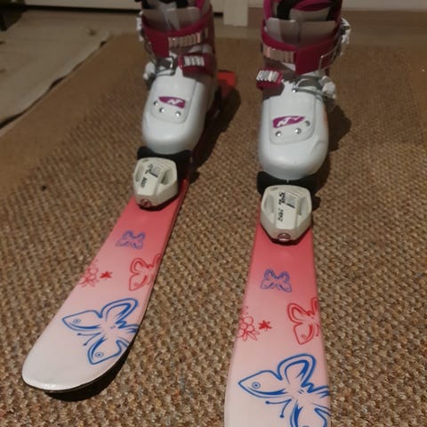 Lasten laskettelusetti, sukset, sauvat ja monot. Monot ovat kooltaan 23.0. Eli vastaa kokoa 36,5