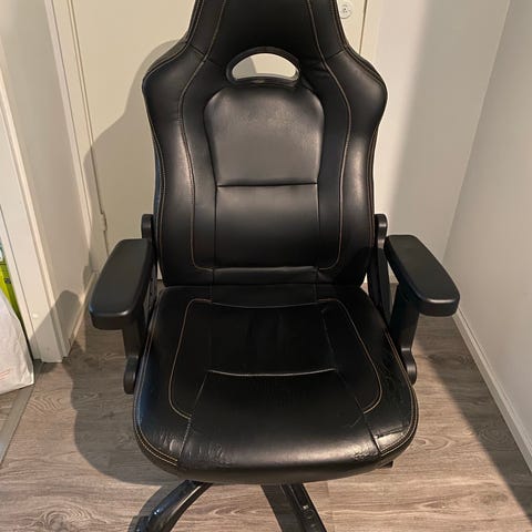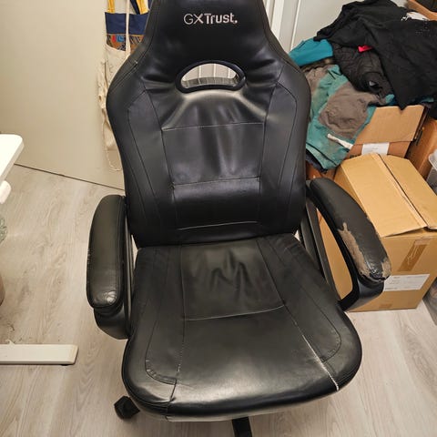 Annetaan musta painava pelituoli tai toimistotuoli. Mekanismit ehjät, ulkoisesti kärsinyt. Säilytetty vain sisätiloissa. Vain nouto, ei varauksia.