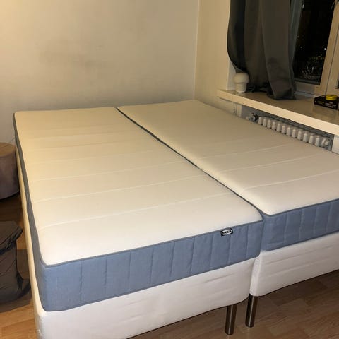 160x200 Jenkkisänky jossa Ikean äkrehamn kiinteä patja sekä vaaleanharmaa/beige runko. Sängyssä käytetty aina patjan suojusta, mutta oleellisesti patjan päällinen pestään myös ennen luovutusta. Ei tarvitse välttämättä erillistä sijauspatjaa. Korkeus kokonaisuudella on noin 62cm.