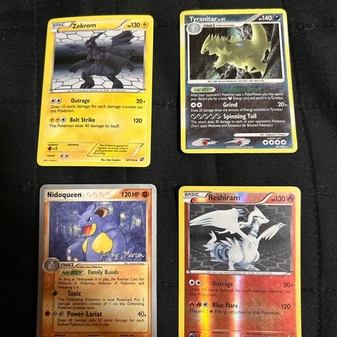 Pokémon keräilykortit Zekrom, Reshiram, Nidoqueen, Tyranitar