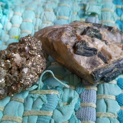 Pieniä turmaliineja, kuvassa kolikko havainnollistamassa. Keräilyyn, tai näitä voisi myös pyöröhioa. Muutama ns. vesimeloni-turmaliini joukossa.