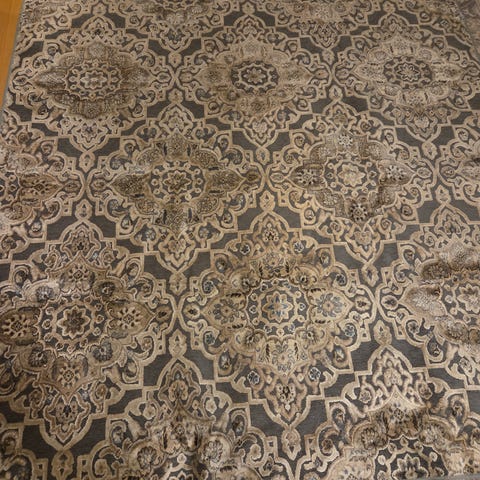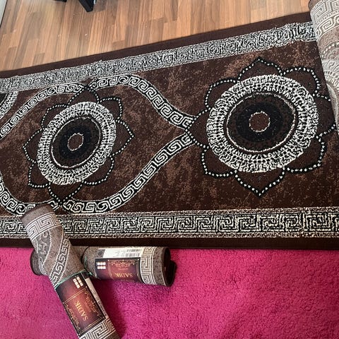 Kaunis vaalea matto, jossa on kuvioitu pinta. Matossa on joitain tahroja, mitä ei ole koitettu poistaa.