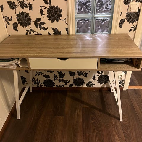 Valkoinen, tukeva ja hyväkuntoinen pöytä. Kaappi jossa hylly. Pieniä käytönjälkiä. Pituus 103 cm, leveys 44 cm, korkeus 71 cm.