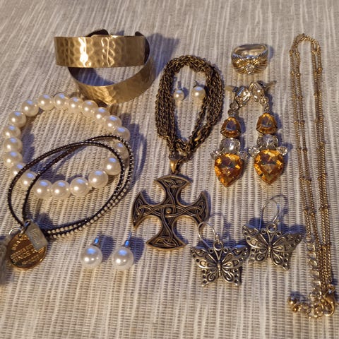 Erilaisia koruja, mm. kaulakoruja ja niissä aidot hiotut kivet, sormus jossa nahkaa, 925 leimatut hopeiset rannekoru ja perhos korvakorut. Korut puhdistettu ja kiillotettu. Hintaan sisältyy paketointi ja postitus.