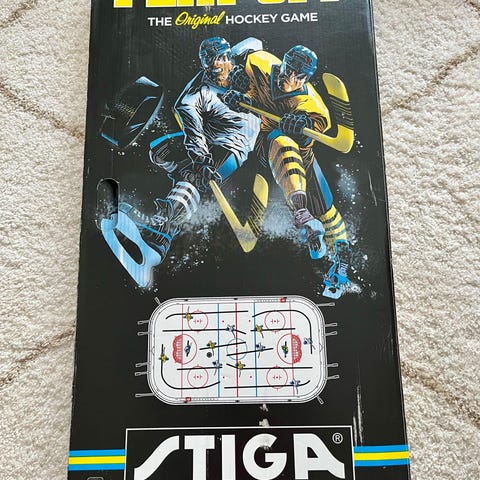 Stiga pöytäjääkiekko peli, jossa on pienoishahmot ja maalit kummassakin päässä. Peli on tarkoitettu pöydälle ja sisältää pelaajat, maalivahdit sekä pelikentän, jossa on eri yritysten mainoksia.