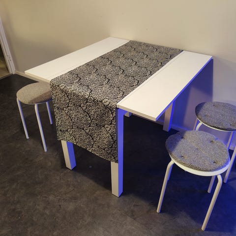 IKEAn pöytä, harmaa väri. Suorakulmainen pöytä, jossa metalliset jalat ja tasainen pöytälevy. Sopii monipuoliseen käyttöön esimerkiksi työ- tai ruokapöytänä.