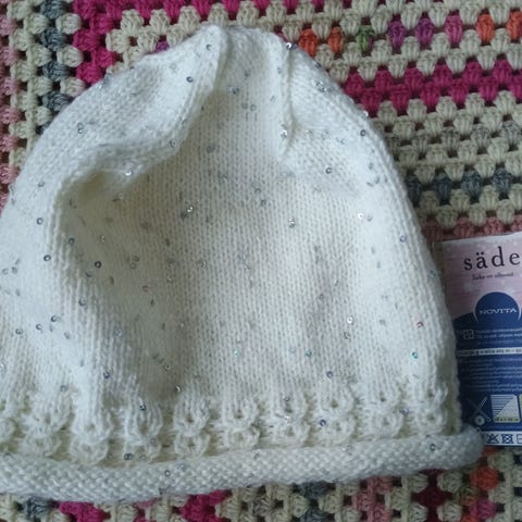 Luonnonvalkoinen palmikkomyssy on hieman korkeampi