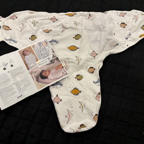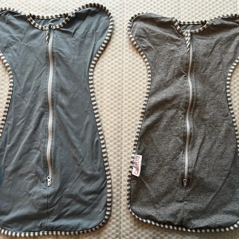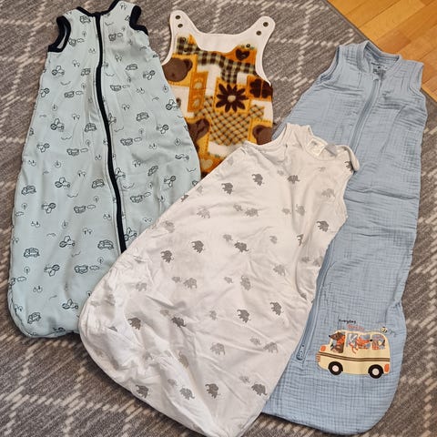 Väri minttu ja harmaa. Käsille aukot kun vauva oppii kääntymään. Siisti yhdellä käytetty.