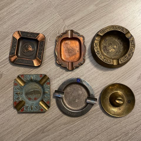Kolme vanhaa tuhkakuppia. Hienosti koristeltu.