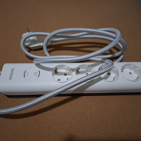 Philips Sovitin, jossa on neljä pistorasiaa ja kaksi USB-porttia. Sovitin on tarkoitettu pistorasian laajentamiseen ja USB-laitteiden lataamiseen samanaikaisesti. Huom. Yhdysvaltojen jännitteellä tarkoitettu!