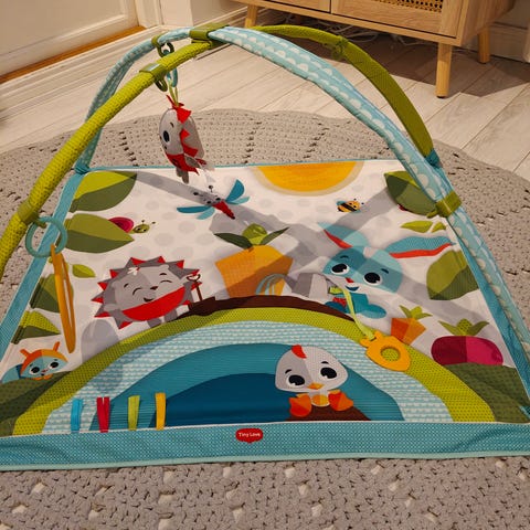 Hyväkuntoinen vauvan leikkimatto lelukaarella. Kaareen saa kiinnitettyä vielä pari lelua, alkuperäiset mennyt rikki.