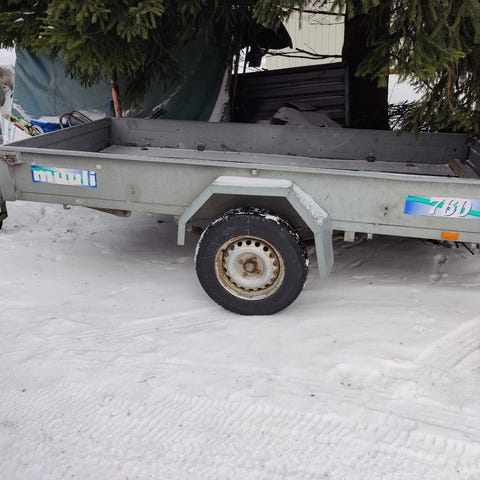 Jullikka peräkärry, jossa kippikori. Käytetty peräkärry tavaroiden kuljetukseen. Varustettu kuomulla, joka suojaa kuljetusta ja helpottaa lastausta.
