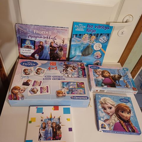 Laulava laukku (toimii), palapeli(palat tallella) ja Frozen Elsan linna sekä Tuire ja mansikkakilpurihahmot