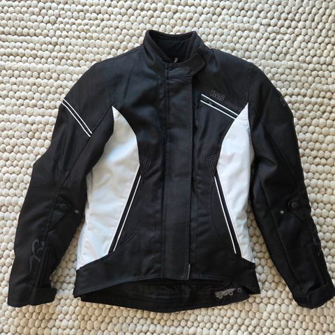 Ajotakki jossa olkapää- ja kyynärpääsuojat. Taskut vedenpitävät. Etupuolen väri haalistunut.