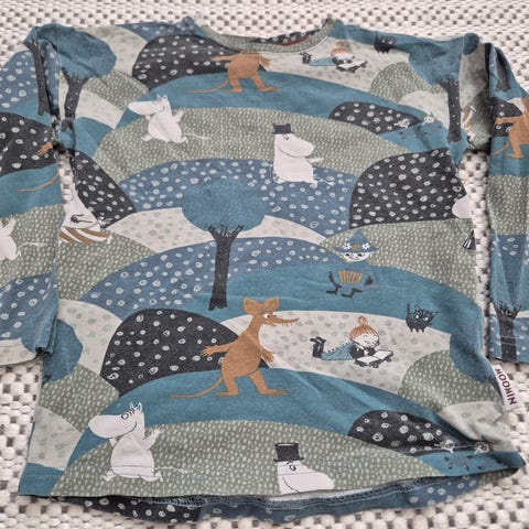 Moomin lasten paita. Polarn o pyret lasten farkut. Koko 104