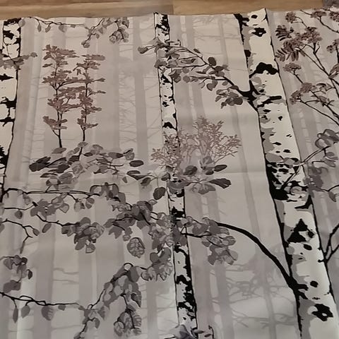 Kangas 83% puuvilla, 17 % polyesteri. Yläreunaan ommeltu rypytysnauha.