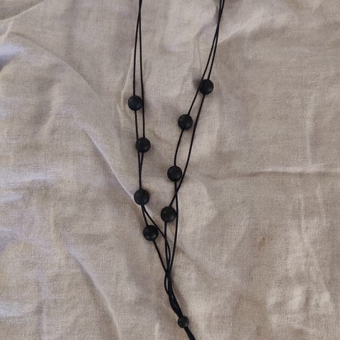 Neljässä nauhassa luonnonvaaleita ja mustia puuhelmiä,nauhoissa beigeä ja mustaa väriä