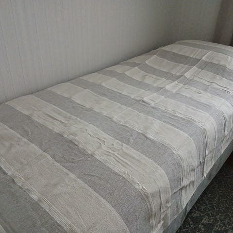 Topattu päiväpeite, kaksi puoleinen. Toinen puoli sinikuvioinen, toinen puoli vaaleansininen. Valmistaja Porin Villa ja Peite.