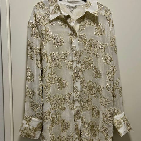 MSCH Copenhagen ihana kiiltävää ja laskeutuvaa kangasta oleva kauluspaita-tyylinen paitapusero, koko M. Nappilista ei mene alas asti. Hiansuissa kaksi nappia. Musta pohja, vaaleansinistä ja luonnonvalkoista kuviointia. Kunto hyvä.