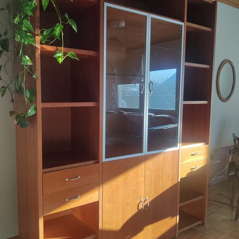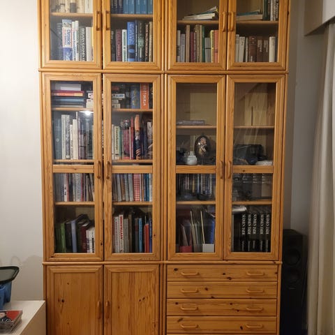 Myydään puinen kirjahylly lasiovilla. Hieman käytön jälkiä, mutta muuten ehjä ja siisti.