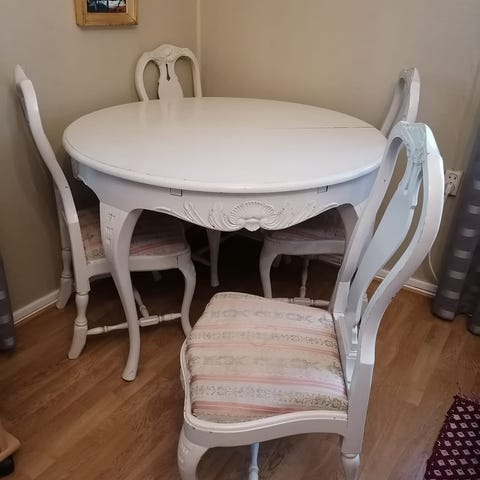 Myydään jurvalainen barokki ruokailuryhmä 6 tuolilla. Tähän löytyy myös lisäpala kannen alta. Pientä käytön jälkiä löytyy