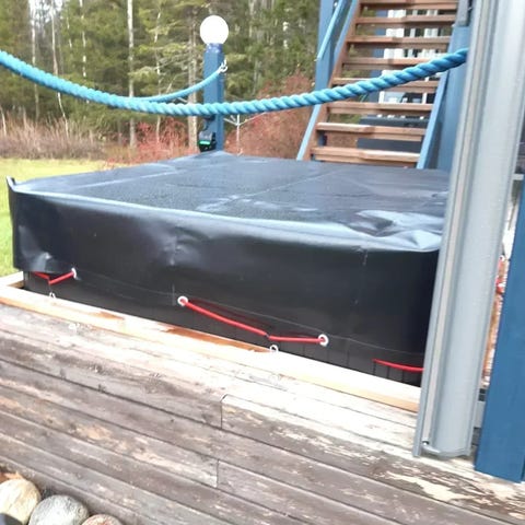täysin veden ja tuulenpitävä suojapressu jossa on kunnon UV- ja Homesuojattu vahva Pvc-kangas. Sopii mainiosti eristekannen suojaksi estämään veden jäähtymistä sekä suojaamaan UV-säteilyltä, lialta, roskilta, tuulelta ja pidentämään eristekannen käyttöikää huomattavasti.
