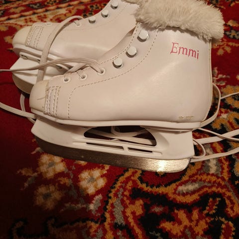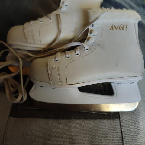 Lasten luistimet, koko 29, valkoinen väri. Merkki Angel. Kaunoluistinten ulkonäkö mutta terättömät.