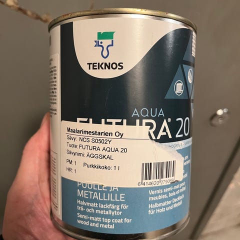 Teknos Saunasuojalakka, tarkkaa värisävyä ei ole tiedossa (kyljessä on TM T3015), mutta ruskea pitäisi olla. Ostettu uutena torista mutta ei tullutkaan itselle käyttöä, joten en ole edes avannut purkkia.