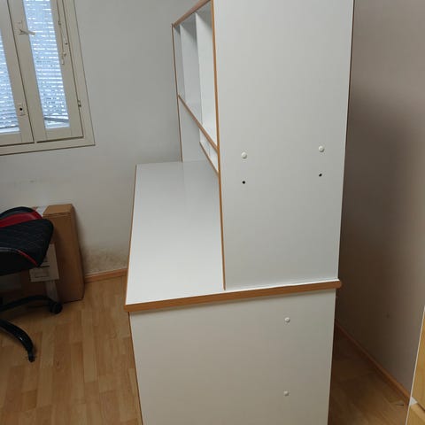 Lasten kirjoituspöytä sinivalkoinen, täyspuinen, 5 laatikkoa+ tuoli