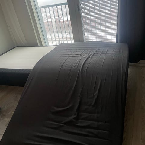 Jysk sänky mustalla verhoilulla. Sängyssä on puinen runko ja metalliset jalat. Sopii makuuhuoneen sisustukseen. Vain vuoden käytössä ollut. Sijauspatja (ei pesty) saa halutessa mukaan, muutama tahra on. Tiheällä pussi jousituksella. https://jysk.fi/makuuhuone/patjat/runkopatjat/runkopatja-120x200cm-spongi-musta-06-flya-kova Vain nouto.