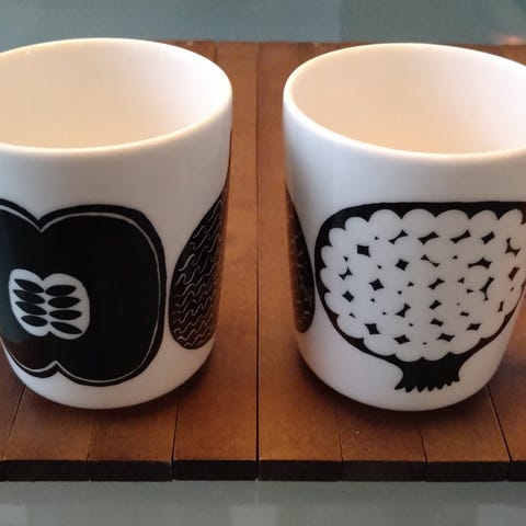 Marimekon Oiva-sarjan Kompotti-muki vihreällä taustavärillä