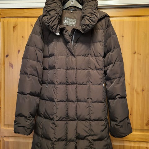 Hyväkuntoinen naisten hupullinen Joutsen untuvatakki. Malli on "Sally".