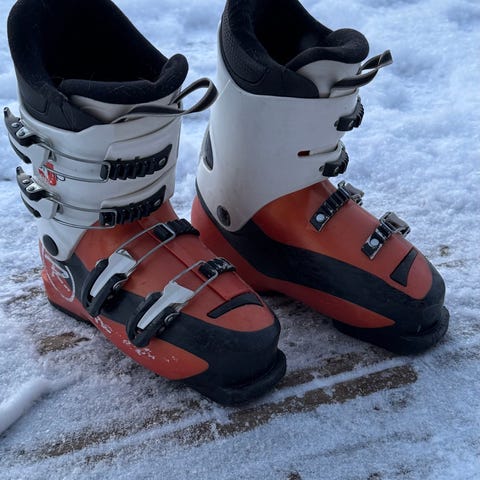 Rossignol laskettelumonot harmaana ja punaisena, koko 235 (275 mm). Monoilla laskettu yhden kauden.