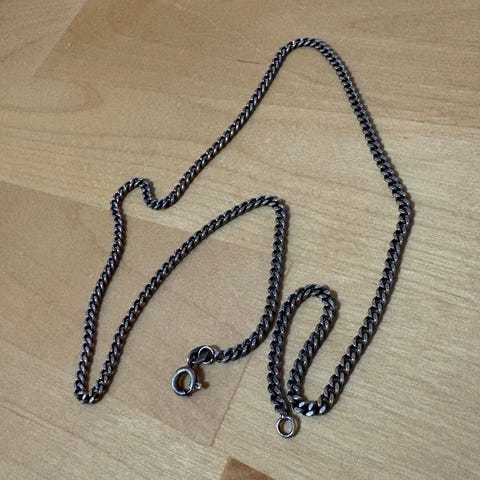 Myydään hopeinen (835) panssariketju, jonka pituus 38 cm. Työntömitalla mitattuna leveys 1,5 mm ja paksuus 0,9 mm.