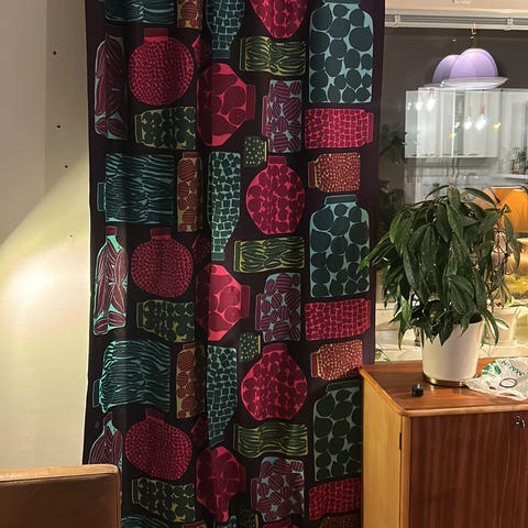 Itseommeltu sivuverho Marimekon mustavalkoisesta Kuusikossa-kankaasta. Värit kirkkaat, ollut vain vähän aikaa käytössä. Vain nouto