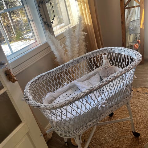 Myydään rottingista valmistettu vauvan kehto.