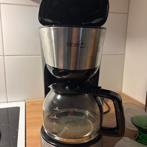 Tuntematon kahvinkeitin mustalla värillä. Laite sisältää lasisen kahvipannun ja veden mitta-asteikon. Virtakytkin laitteen alaosassa.
