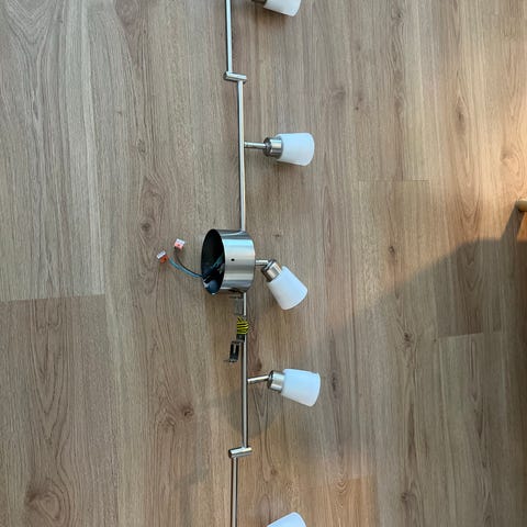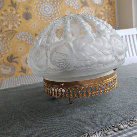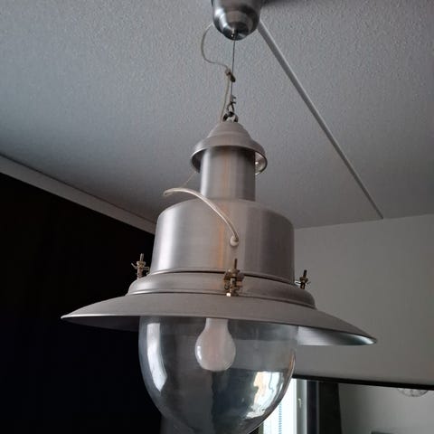 Riippuvalaisin, jossa on suuri lasikupu ja kupun sisällä on koristenauhaa ja metalliosat. Valaisin kiinnitetään kattoon ja siinä on sähköjohto (näkyy kuvassa)liittämistä varten. Sopii sisätilojen valaistukseen. Hinta 30€ ja haku Lahti Metsäpelto.