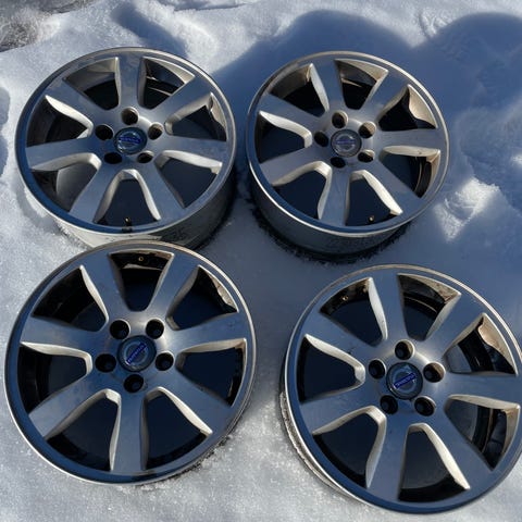 Volvon alkuperäiset 16-tuumaiset vanteet. Yksi vanne saanut osumaa katureunuksesta (näkyy kuvassa) ja pala puuttuu. Muut vanteet suorat ja ehjät. Päällä lähes loppuunajetut Continental IceContact 2-nastarenkaat. Myydään koko setti kerralla.