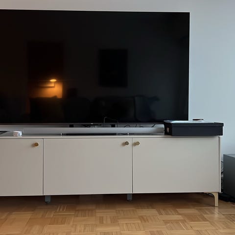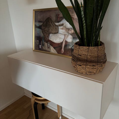 Myyntiin IKEAn Bestå senkki/lipasto/tv-taso, jonka ovet aukeavat painalluksella. Hyllyt voi nostaa pois paikaltaan ja siirtää helposti. Jalkoihin olemme laittaneet huopatassut vielä alle.